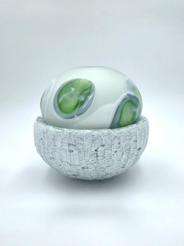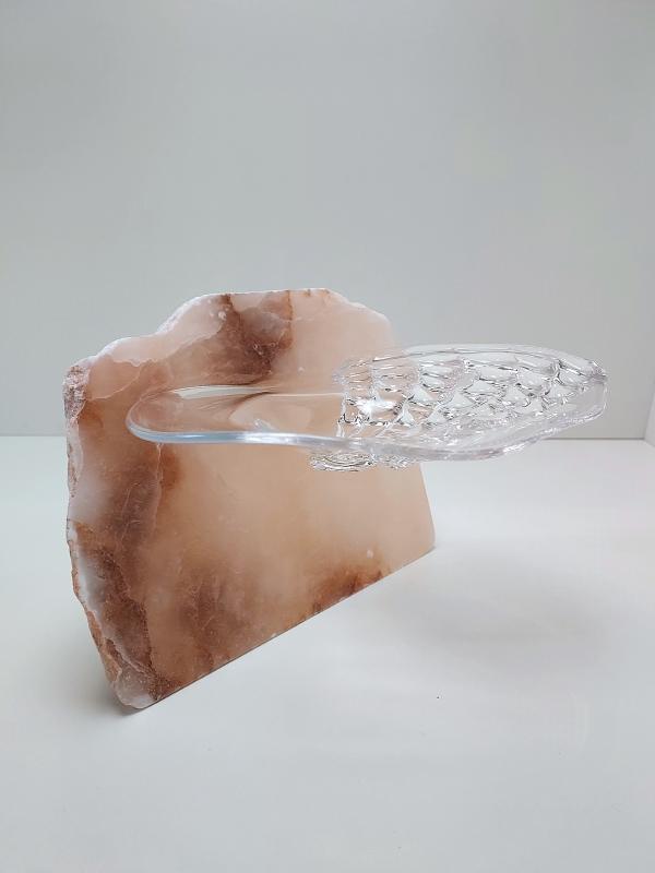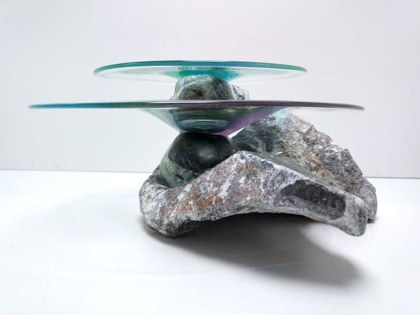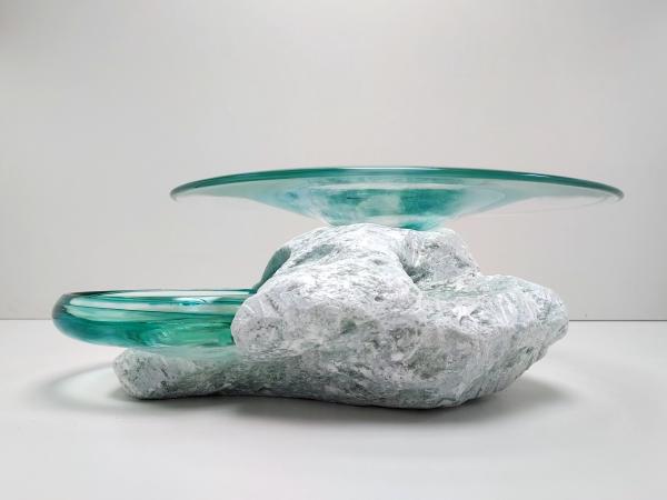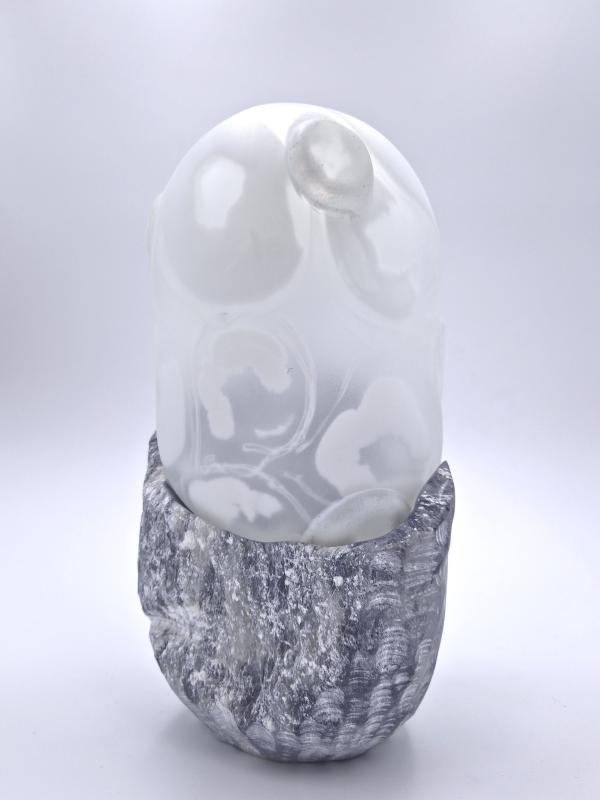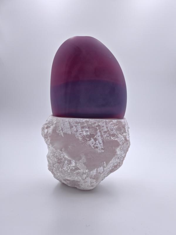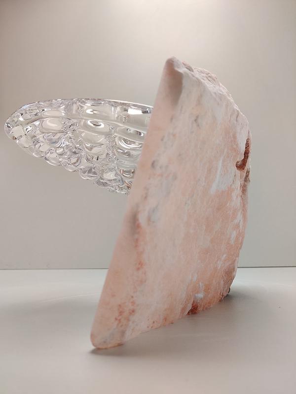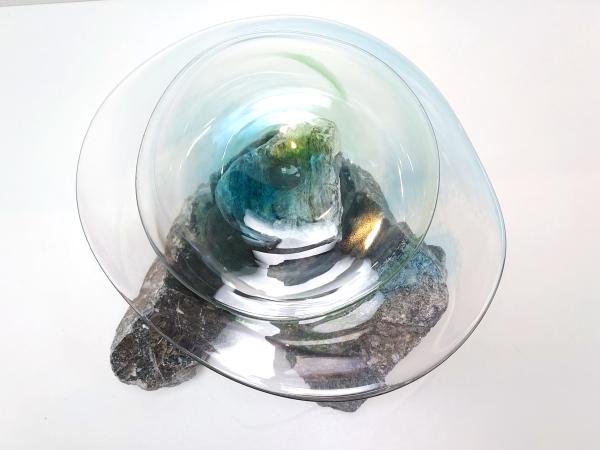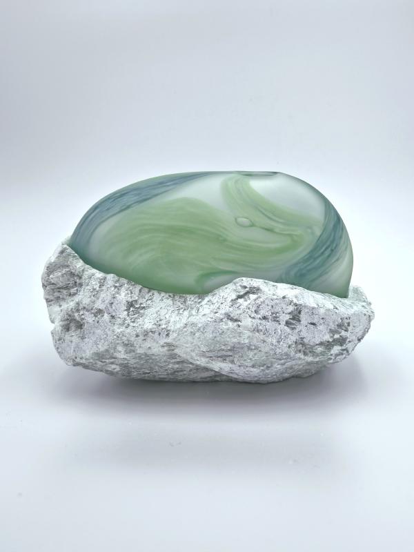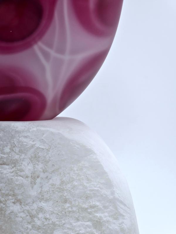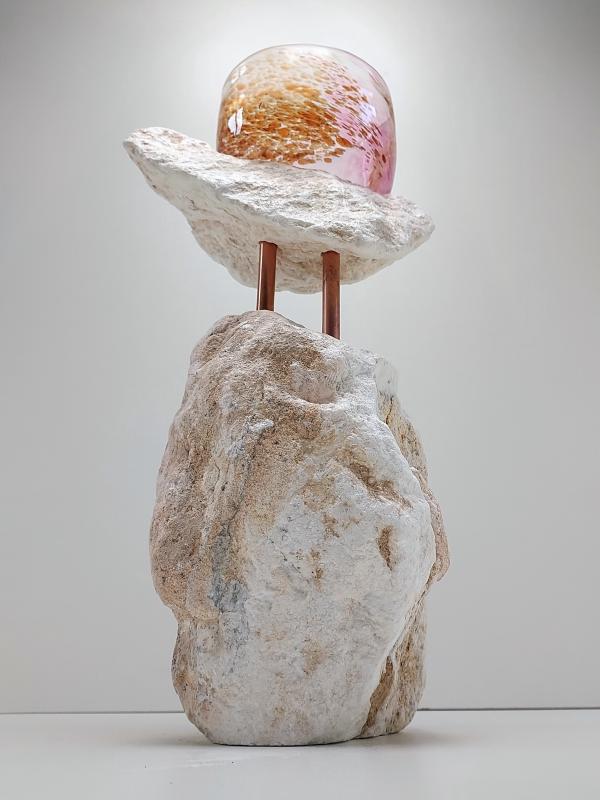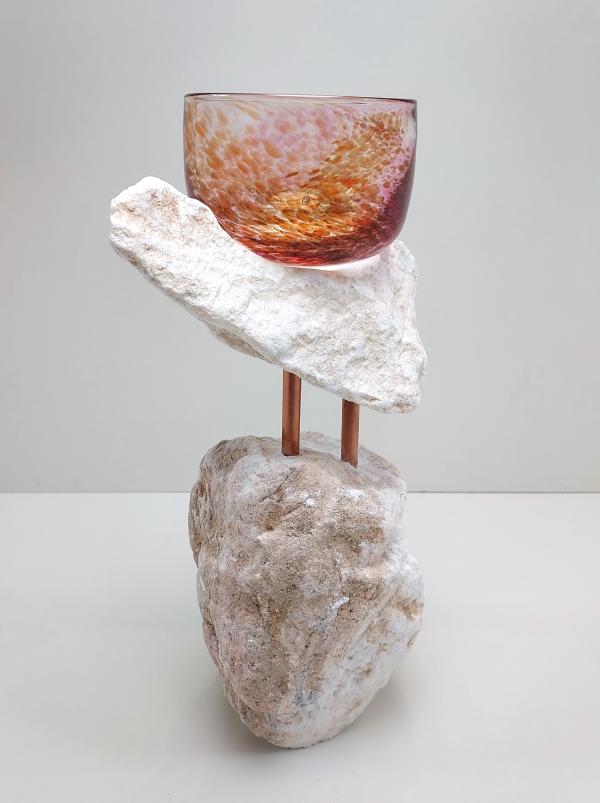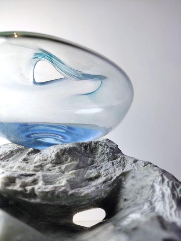 Het contrast tussen ruw steen en kwetsbaar glas fascineert mij. Het zijn tegenpolen, maar tegelijkertijd delen ze iets: beide zijn natuurlijke materialen die een gevoel van rust oproepen. Wanneer ze worden gecombineerd, ontstaat er een unieke vorm van harmonie.